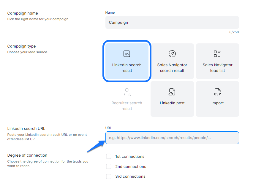 In Marketing Monk, paste your LinkedIn search URL into the designated area. Give your campaign a name that resonates with your goals.