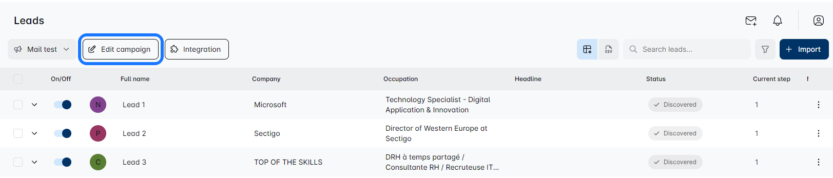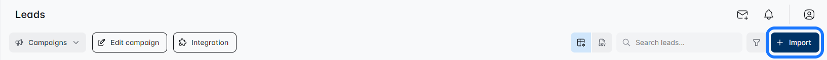 Click on the name of the campaign you want to expand. This will take you to the Leads List page, where youโll find a shiny button that says โImportโ Click it, and upload your CSV file filled with fresh leads, or opt for adding a Search URL.