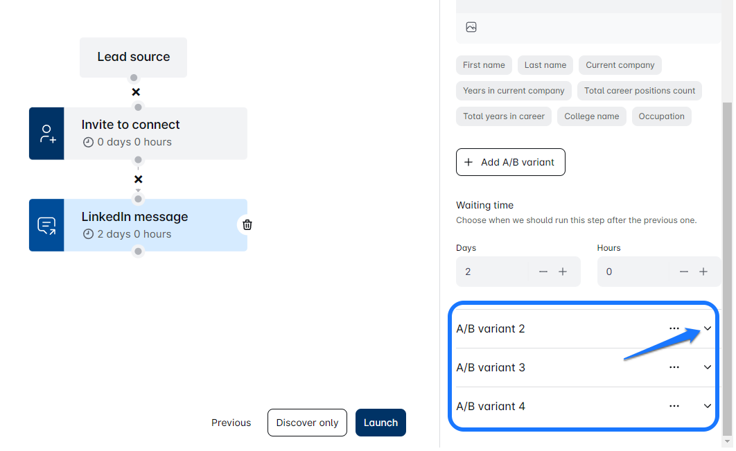- In Marketing Monk, you can test different parts of your message copy, such as LinkedIn messages, Emails, InMails, Invites to Connect, or even the timing between the steps during the campaign sequence creation process. You can create up to 5 different test variants!